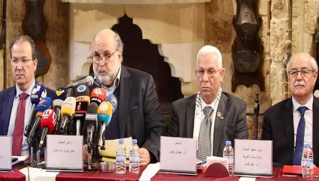 تحدّث الدكتور جمال واكيم ممثّلاً مركز دراسات الوحدة العربية، فتطرّق إلى ما يجري على أرض فلسطين من حرب ومجازر ضد الإنسانية يرتكبها العدو، مشيرًا إلى التهديدات التي تتعرّض لها الهوية العربية بالإضافة إلى دور الأكاديميين اتجاه هذه القضية، وأضاف أن عملية طوفان الأقصى جاءت بعد فرض الولايات المتحدة الأميركية منظومة شراكة سياسية واقتصادية بين الهند وبعض الدول العربية وأوروبا، وتهميش دولاً أخرى، ورداً على عملية صهيونية لفرض يهودية دولة إسرائيل والتخلّص من المقاومة الفلسطينية، وترحيل الشعب الفلسطيني الى سيناء ولبنان والأردن. كما لفت إلى أن ما يجري في فلسطين يهدّد الأمن القومي العربي بشكل عام، وأن هناك هجمة على الهويّة العربية وعلى الإسلام للقول أنّه مثل الحضارات القديمة التي انتهى دورها، مستغربا الدور الخجول للجامعات العربية ولدور الأكاديميين العرب الذين فقدوا دورهم في التوعية.