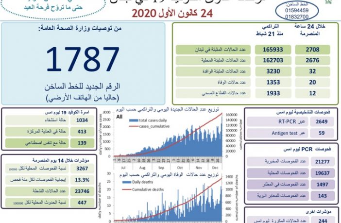 محليات وزارة الصحة: 2708 حالات جديدة بفيروس كورونا في لبنان و20 حالة وفاة By F.S ديسمبر 24, 2020 لا توجد تعليقات أعلنت وزارة الصحة عن تسجيل 2708 حالة جديدة في لبنان و20 حالة وفاة featured