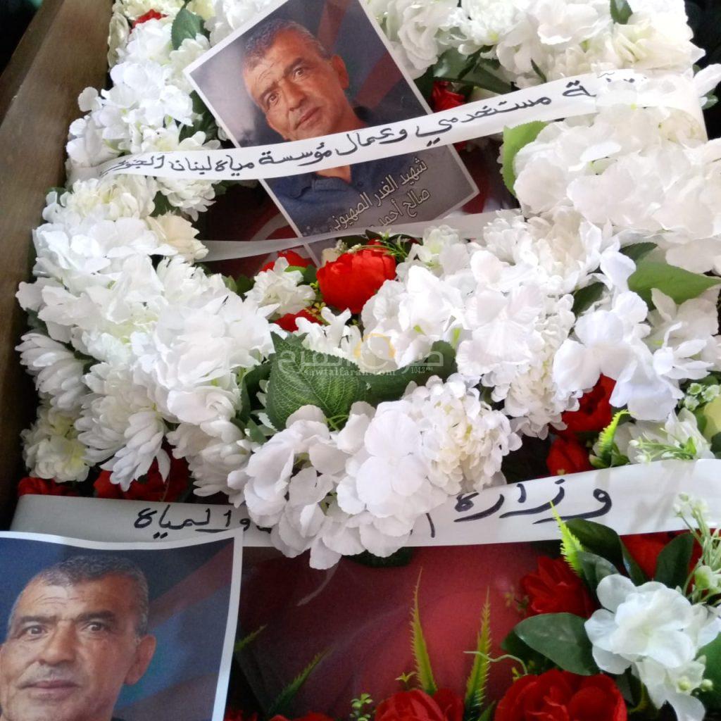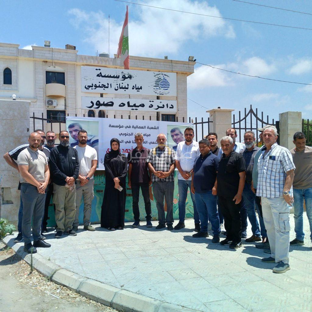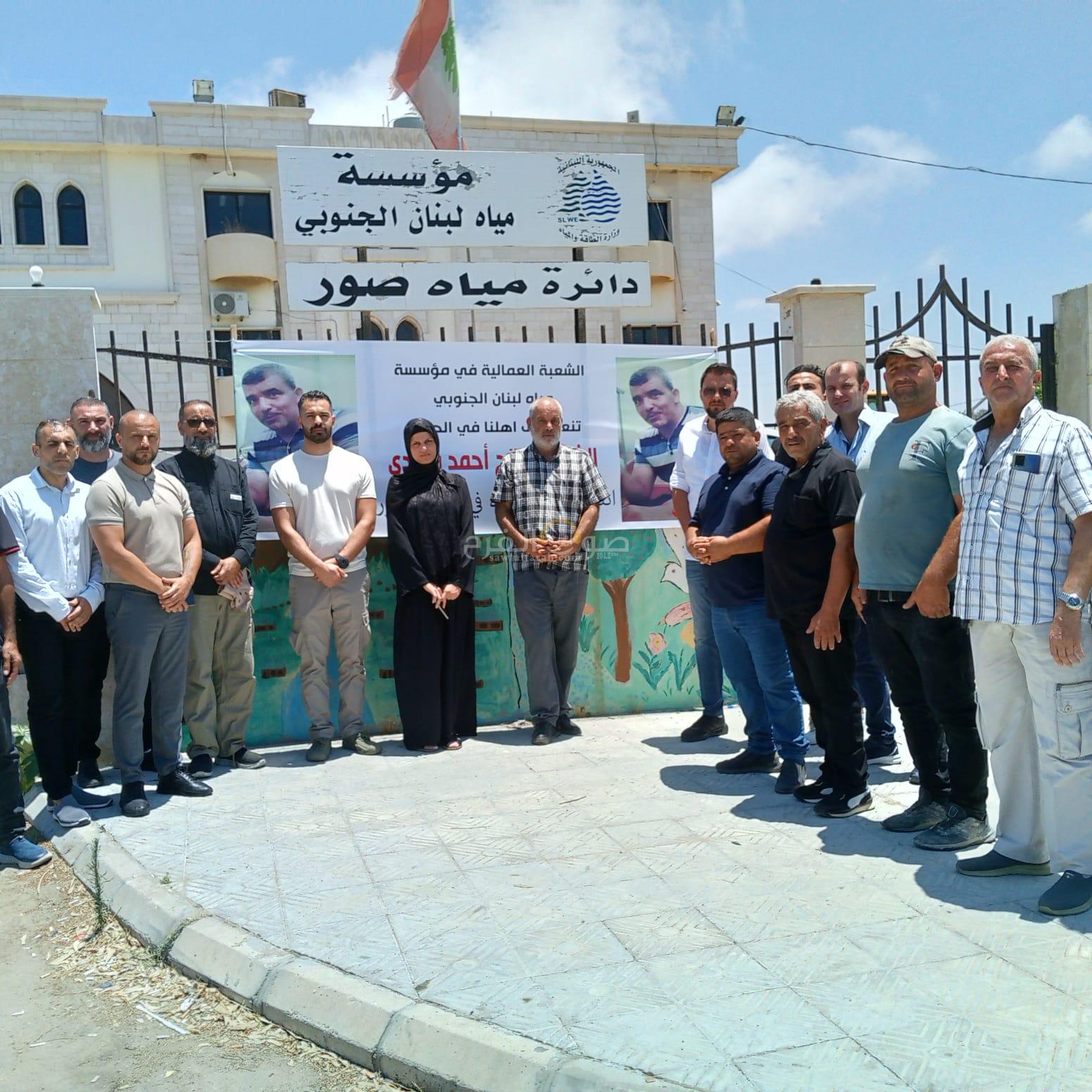 استنكارا للجريمة التي قام بها العدو واستهدف فيها العامل في سبيل الإنسانية والواجب صالح احمد مهدي في الناقورة، توقفت دائرة مياه صور وعمالها عن العمل وتقدم الحضور رئيس الدائرة ورئيس النقابة وأمين السر في وقفة استنكار أمام مبنى الدائرة توجهت برسالة واضحة أمام العالم والجمعيات الإنسانية والدولية حماية اهلنا في كل مدن وبلدات الجنوب من الهمجية العدوانية .واثنت على الجهود المبذولة من قبل العمال وتأمين مصالح الناس مهما كلف الثمن .