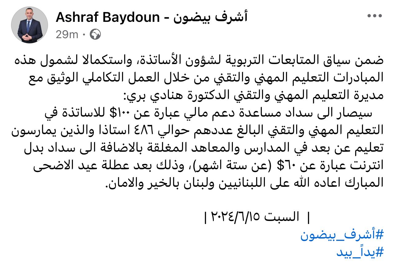 سيصار الى سداد مساعدة دعم مالي عبارة عن ١٠٠$ للاساتذة في التعليم المهني والتقني البالغ عددهم حوالي ٤٨٦ استاذا والذين يمارسون تعليم عن بعد في المدارس والمعاهد المغلقة بالاضافة الى سداد بدل انترنت عبارة عن ٦٠$ (عن ستة اشهر)، وذلك بعد عطلة عيد الاضحى المبارك اعاده الله على اللبنانيين ولبنان بالخير والامان.