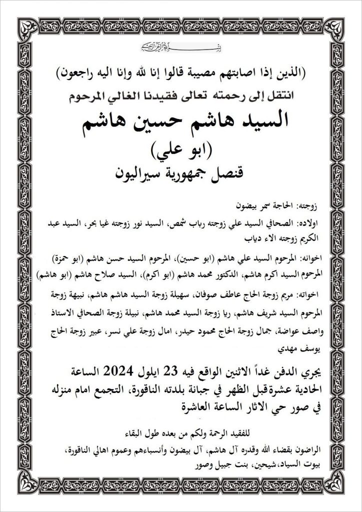 بقلوب مؤمنة بقضاء الله وقدره، ننعي إليكم وفاة قنصل سيراليون السيد هاشم حسين هاشم ( أبو علي )..