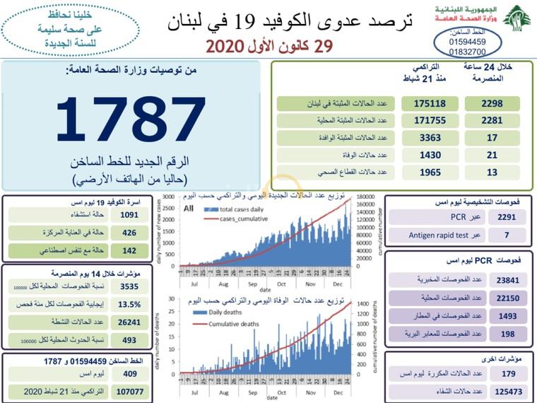 محليات وزارة الصحة: تسجيل 2298 اصابة جديدة بكورونا و21 حالة وفاة By F.S ديسمبر 29, 2020 لا توجد تعليقات أعلنت وزارة الصحة العامة، في تقريرها اليومي،عن تسجيل 2298 اصابة جديدة بكورونا و21 حالة وفاة. وبذلك ارتفع إجمالي الإصابات إلى 175118 إصابة بينما أصبح إجمالي الوفيات 1430 وفاة. وجاء في التقرير: featured