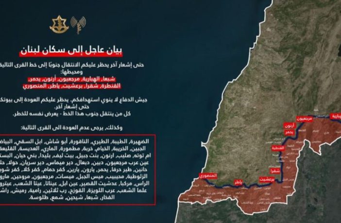 وحدد البيان عددًا كبيرًا من القرى والبلدات التي يُمنع سكانها من العودة إليها أو التحرك نحوها.