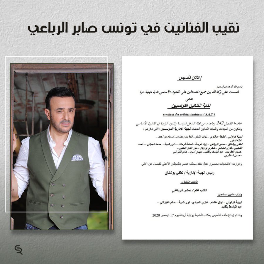 أعلن الفنان صابر الرباعي تعيينه نقيبًا للفنانين التونسيين وذلك بعدما نشر صورة من الإعلان التأسيسي للنقابة.