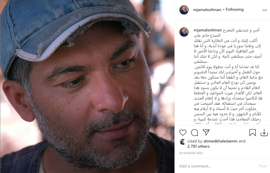 وأضاف سليمان:”كنا قد تحدثنا أنا وأنت مطولاً يوم الاثنين حول العمل وأخبرتني انك ستبدأ التصوير مع بداية العام، واتفقنا أننا سنكون معا بعد يومين كي نودع العام الحالي ونستقبل العام القادم وتمنينا أن لا يكون بسوء هذا العام، لكن الأقدار غيرت المواعيد والخطط فلا الكاميرا ستجدك وراءها ولا العام الجديد سيجدك في استقباله، فقد أصبحت في ملكوت آخر حيث لا أسماء ولا أرقام فيه للأيام والشهور، ولا حدود فيه بين السنين.