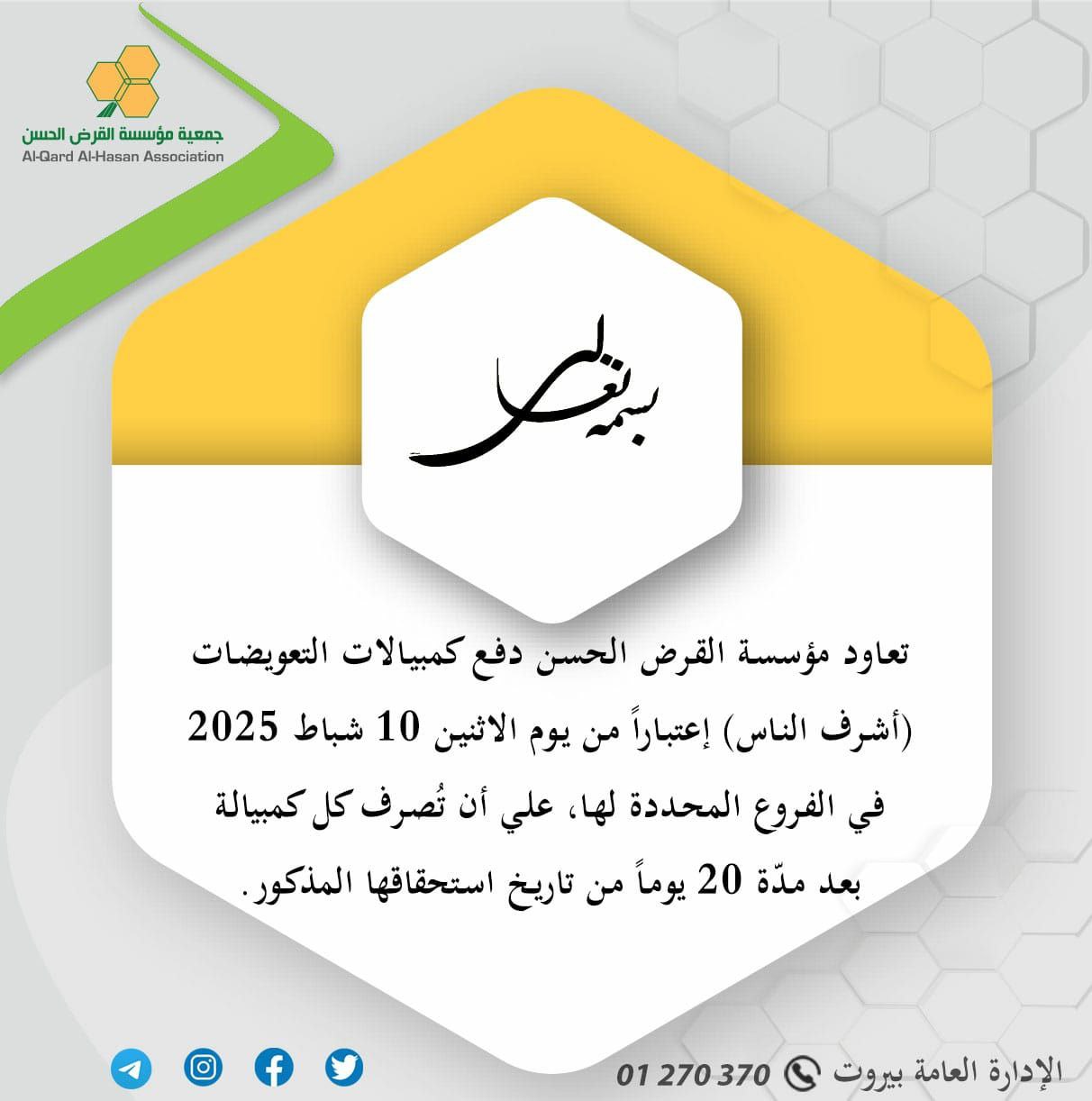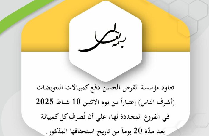 أخبار عاجلة تعاود مؤسسة القرض الحسن دفع كمبيالات التعويضات اعتبارا من يوم الإثنين 10 شباط 2025 By F.S فبراير 8, 2025 لا توجد تعليقات مؤسسة القرض الحسن