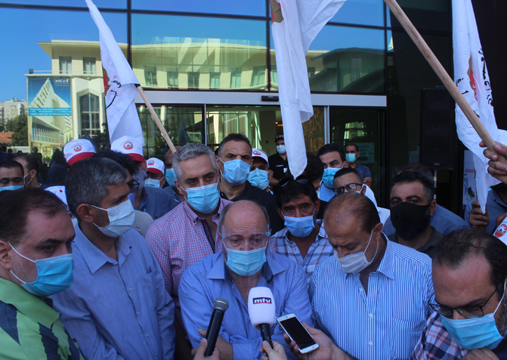 تجمّع عدد من ممثلي النقابات العمالية أمام مدخل مركز حليم وعايدة دانيال الأكاديمي الطبّي التابع لمستشفى الجامعة الأميركية في بيروت، رافعين رايات الاتحاد العمالي العام.