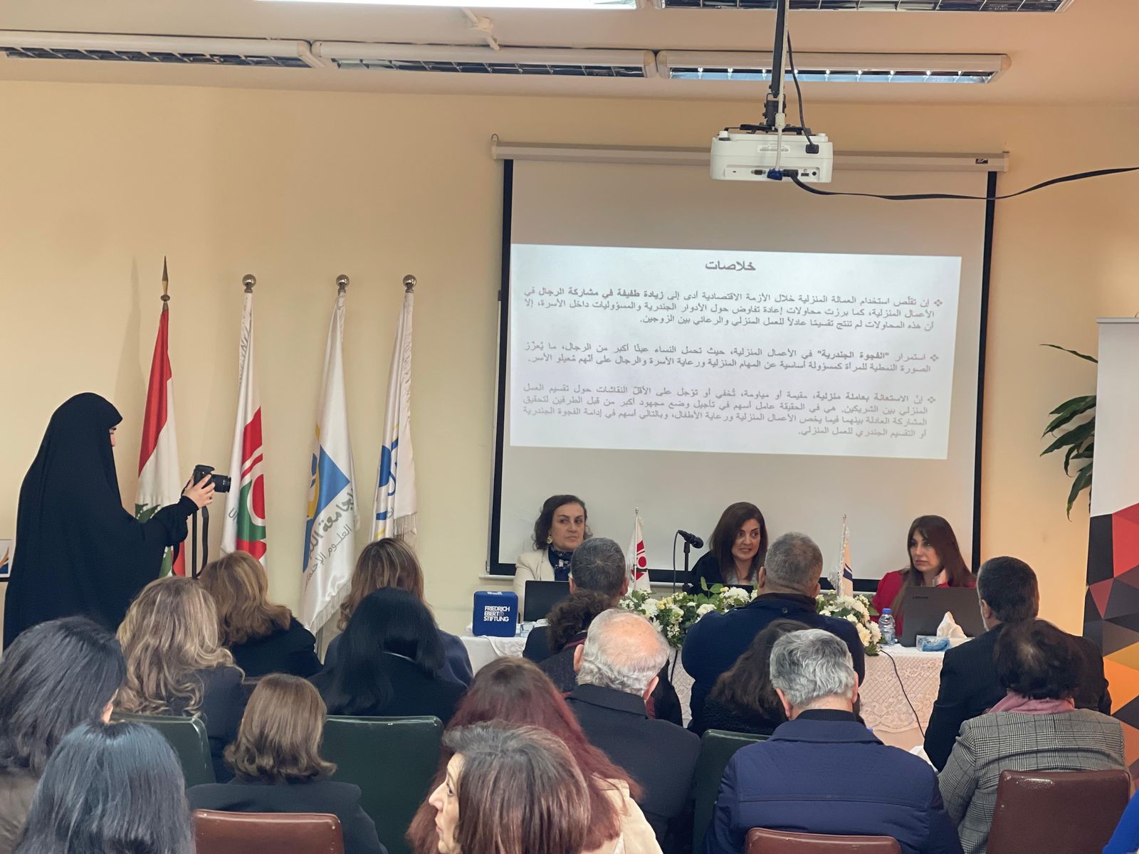 بحضور ممثّلة اللبنانية الأولى السيّدة نعمت عون الدكتورةجلنار محسن، وبرعاية وحضور عميدة معهد العلوم الاجتماعية في الجامعة اللبنانية البروفسورة مارلين حيدر، وبدعوة من مؤسّسة فريدريش إيبرت في لبنان، وبالتعاون مع معهد العلوم الاجتماعية (الفرع الأول) في الجامعة اللبنانية، ومركز أبحاث المعهد في الجامعة اللبنانية (مختبر علم اجتماع العائلة)، ندوة علمية تحت عنوان ” إعادة النظر في التقسيم الجندري للعمل المنزلي في ضوء انسحاب العمالة المنزلية” حضر الندوة كل من عميدة المعهد البروفسورة مارلين حيدر، وممثّل فريدريش إيبرت في لبنان السيّد ميرين عبّاس، ومدير مركز الأبحاث في المعهد البروفسور حسين أبو رضا، ومدير المعهد في الفرع الأول الدكتور علي زعيتر، وممثّلة منظّمة الأسكوا في لبنان السيدة ربى عرجا، وممثّلة المجلس النسائي اللبناني السيّدة دنيا فيّاض، وممثّلة مجلس كنائس الشرق الأوسط البروفسورة لور أبي خليل، ورئيسة الشبكة الدولية لدراسة المجتمعات العربية البروفسورة ماريز يونس. كما حضر الندوة شخصيات أكاديمية وأساتذة ومحاضرين جامعيين، وباحثين من مراكز دراسات، وطلاّب طالبات من المعهد، وفعاليات وجهات تربوية وثقافية وإعلامية ومهتمّين.