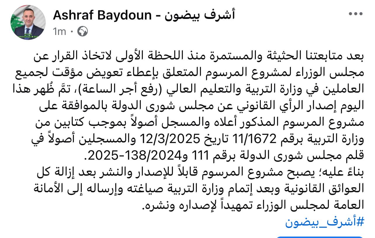 النائب الدكتور أشرف بيضون عبر صفحته: بعد متابعتنا الحثيثة والمستمرة منذ اللحظة الأولى لاتخاذ القرار عن مجلس الوزراء لمشروع المرسوم المتعلق بإعطاء تعويض مؤقت لجميع العاملين في وزارة التربية والتعليم العالي (رفع أجر الساعة)، تمَّ ظُهر هذا اليوم إصدار الرأي القانوني عن مجلس شورى الدولة بالموافقة على مشروع المرسوم المذكور أعلاه والمسجل أصولاً بموجب كتابين من وزارة التربية برقم 11/1672 تاريخ 12/3/2025 والمسجلين أصولاً في قلم مجلس شورى الدولة برقم 111 و138/2024-2025.