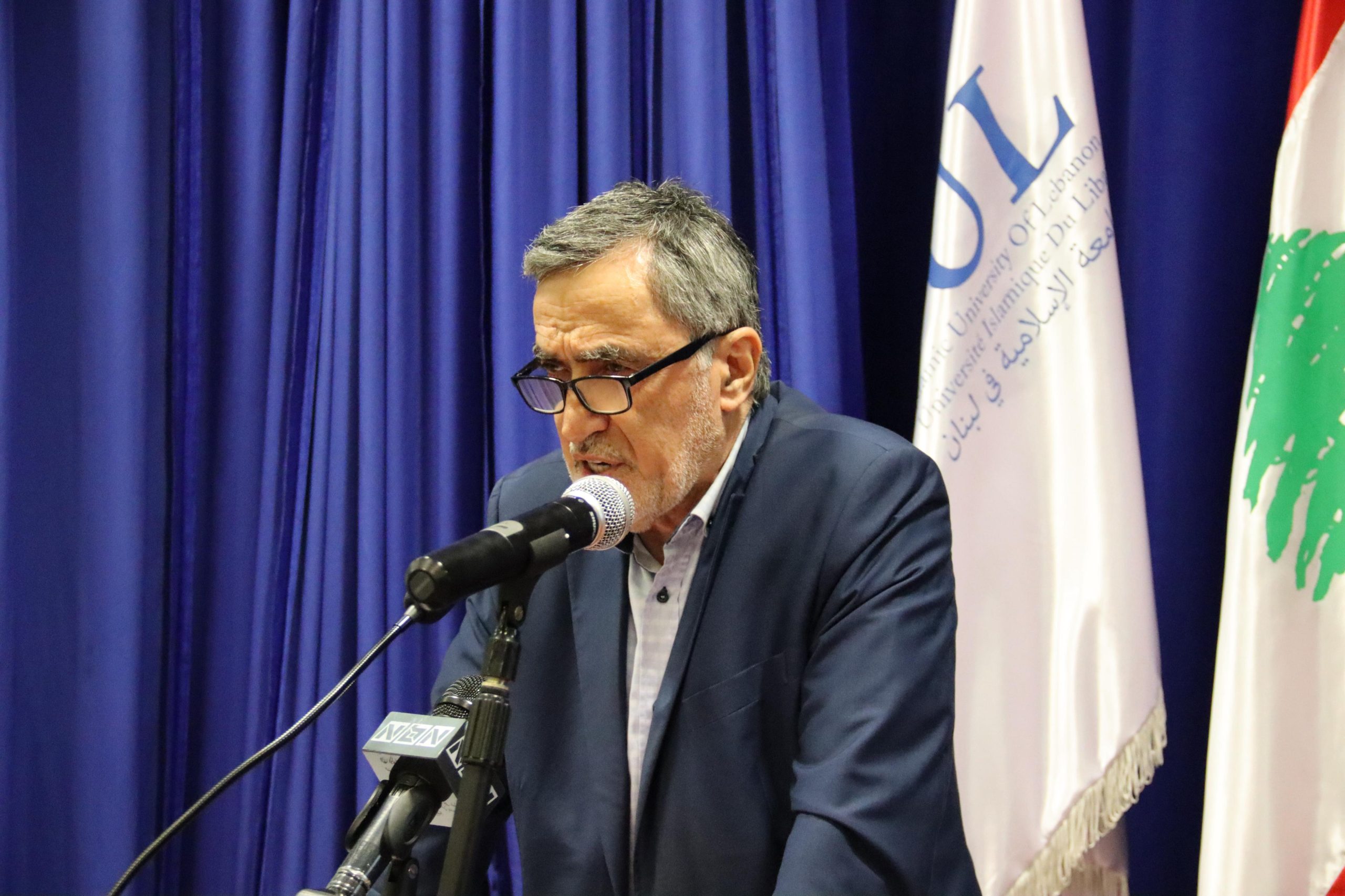 والقى رئيس الجامعة الاسلامية البروفيسور حسن اللقيس كلمة فقال: يسعدُني ويشرّفُني أن نلتقي اليوم في رحاب الجامعة الإسلاميّة، في مناسبة تجمع الفكر والعلم، فالفكر وفاء لقامةٍ وطنيّة ودينيّة، والعلم إضاءة على قضايا تشكّل جوهرَ الكيان اللّبنانيّ وهويتَه، نحتفل فيها بإصدار كتابيْن قيّمين لعميد كلية الدراسات الإسلامية في جامعتنا، يشكّلان إضافةً نوعية إلى المكتبة الوطنية والعربية، ويُعبّران عن التزامنا الأكاديمي والثقافي تجاه قضايا مجتمعنا وبلدِنا.إن كتاب “دولةُ المواطنة في لبنان في رؤية العلامة الخطيب” وكتاب “العيشُ المشترك في لبنان في رؤية العلامة الخطيب”، لا يوثّقان فقط فكرَ أحدِ كبار علماء لبنان وحسب، بل يعكسان أيضًا رؤيةً إصلاحية جامعةً، تسعى إلى ترسيخ قيم العدالة والمساواة والانتماء الوطني، بعيدًا من الانقسام والطائفية. إنّها إعلانٌ عن التزام جامعتنا برسالة الوطن والأنسان، وتأكيدٌ دورها في صياغة خطابٍ فكري يعزّز وحدةَ المجتمع اللبناني على قاعدةِ العدالة والكرامة والمواطنةِ المتساوية.