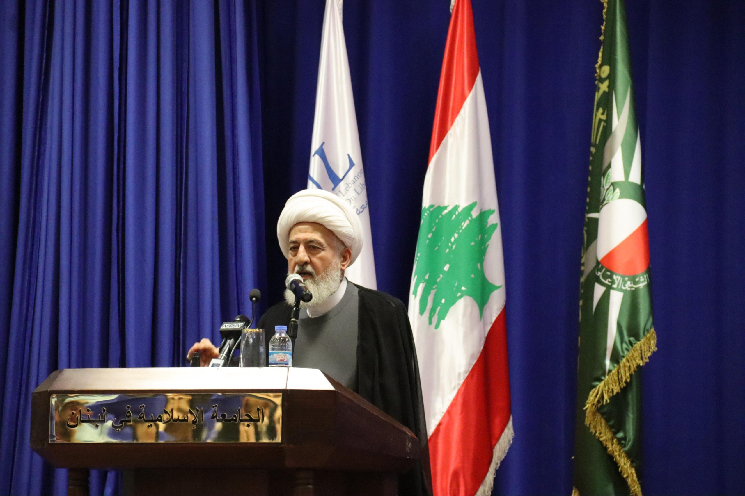 واكد سماحته ان الإنسان هو المحور، حينما ننطلق من الإنسان نلتقي جميعاً، فلننطلق من الإنسان في لبنان لنخرج من هذه الدوائر التي وضعونا فيها، لكل طائفة دائرة لا تستطيع أن تخرج منها، هذا الذي يُجزّء، هذا الذي يضع الحواجز بين الطوائف وبين المذاهب وبين الإنسان والإنسان، هذا لا يبني دولة، ويريد أن يُفرقنا ويريد أن يمنعنا من التلاقي والحوار، الذي يمتنع عن الحوار هو العاجز، والعاجز الذي يأخذ موقفاً مسبقاً عن الآخر ، نحن بحاجة إلى ما يجمعنا وليس إلى ما يُفرقنا، التمايز الديني لا يعطي تمايزاً في الحقوق والواجبات، لذلك نحن بحاجة في لبنان المتنوع مذهبياً وطائفياً ودينياً، نحن بحاجة إلى فكر يجمعنا والفكر الذي يجمعنا هو أن ننطلق من كرامة الإنسان، وأختصر هذه الكلمة وأشكر الأستاذ الدكتور غازي قانصوه على الجهد الذي بذله في إخراج هذين الكتابين، وكما أشكر الجامعة الإسلامية ومعالي الاستاذ الدكتور حسن اللقيس الذي يرعى هذه المناسبات التي يُبرز فيها توجه الجامعة الإسلامية أن تكون منبراً للثقافة، وتظهر فيه هذا التوجه الذي يجمع الناس جميعاً، هذه الجامعة الوطنية اسمها إسلامية ونفتخر بها وبإسلاميتها ولكن إسلاميتها تتناغم وتتحد مع الوطنية.