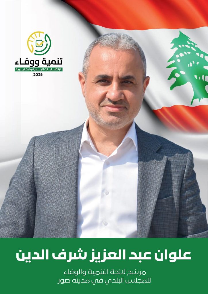 يُعلن السيد علوان عبد العزيز شرف الدين، مدير عام إذاعة وموقع صوت الفرح ورئيس جمعية الفرح الاعلامية الاجتماعية وعضو قيادة حركة أمل في اقليم جبل عامل، عن ترشحه لعضوية المجلس البلدي في مدينة صور في الانتخابات البلدية والاختيارية 2025 ، واضعاً مصلحة المدينة وأهلها أولاً، منطلقاً من ثوابت راسخة، معاهداً أهلنا على العمل الجاد والمستمر من أجل المصلحة العامة، و أن يكون على قدر الثقة، يعمل بكل عزم و ضمير حيّ، ويحمل صوتكم للسير معاً بثبات نحو الافضل..