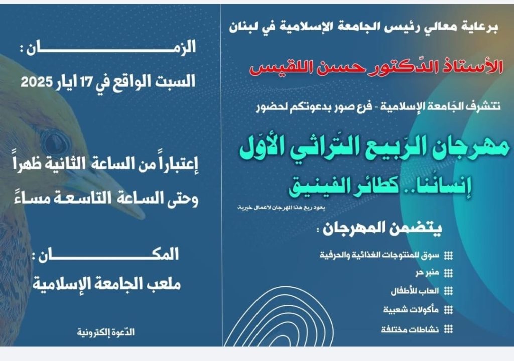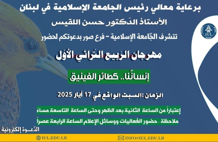 محليات مهرجان الربيع التراثي الأول في الجامعة الاسلامية فرع صور برعاية اللقيس.. هذا السبت By F.S مايو 16, 2025 لا توجد تعليقات اللقيس