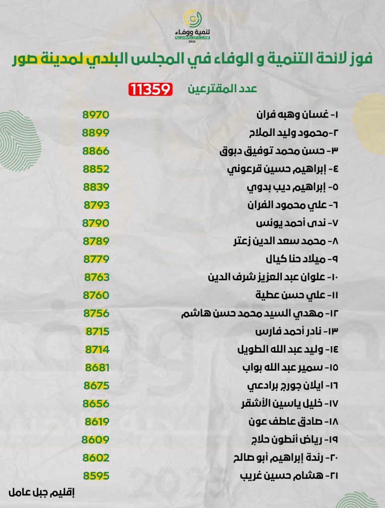 فازت لائحة التنمية والوفاء في مدينة صور بجميع أعضائها في الانتخابات البلدية ، حيث كان عدد المقترعين 11359 وقد جاءت النتيجة على الشكل التالي: