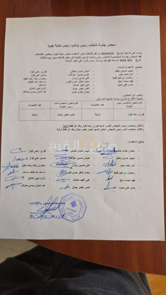 محليات فوزي فواز رئيساً لبلدية جويا و ناصر جمال نائباً للرئيس بالتزكية By F.S يونيو 3, 2025 لا توجد تعليقات جويا
