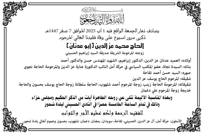 وفيات دعوة لإحياء أسبوع والد النائب عناية عز الدين في شحور By F.S يوليو 31, 2025 لا توجد تعليقات عز الدين