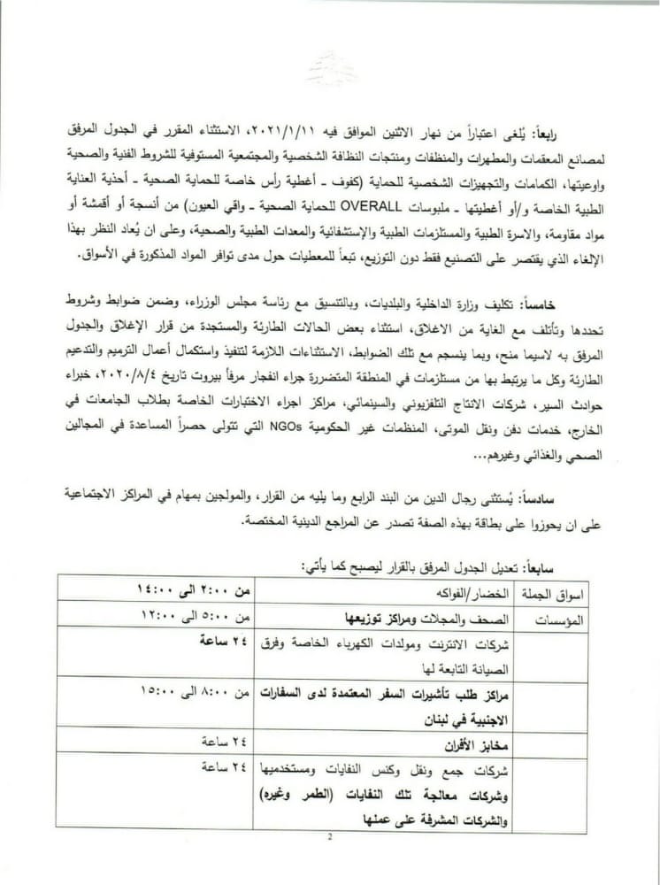 أصدرت رئاسة الحكومة تعديلاً وتوضيحاً على بعض ما جاء في القرار والملحق المرفق بالموافقة الاستثنائية رقم 3/م تاريخ 2021/1/5 المتعلق بالاغلاق الكامل اعتبارا من 2021/1/7 ولغاية 2021/2/1.