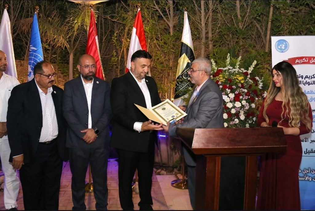 المنظمة العالمية لحقوق الإنسان تكرم الدكتور هشام درويش سفيراً للنوايا الحسنة في جمهورية مصر العربية بحضور أمين عام المنظمة السيناتور السفير الأممي علي عقيل خليل بحضور سفير المرصد الدولي لتوثيق إنتهاكات حقوق الإنسان لدى هيئات الأمم المتحدة السفير الدكتور عباس رمضان.