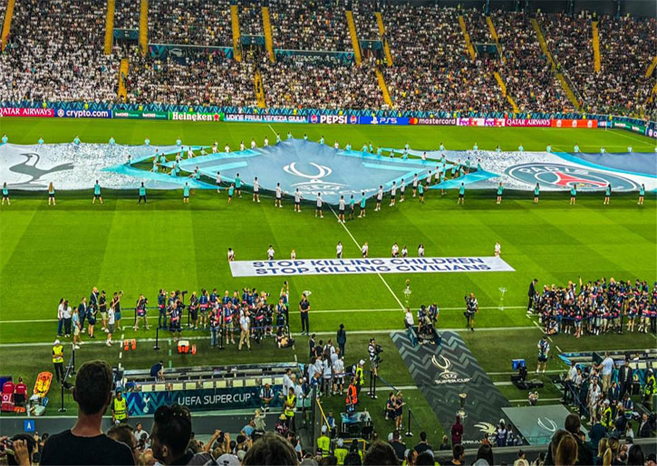 ووضع الاتحاد الأوروبي لكرة القدم “يويفا” شعارًا خاصًا على أرض الملعب قبل انطلاق المباراة، وحملت اللافتة عبارة: “أوقفوا قتل الأطفال.. أوقفوا قتل المدنيين”.