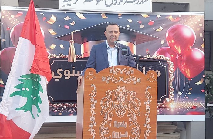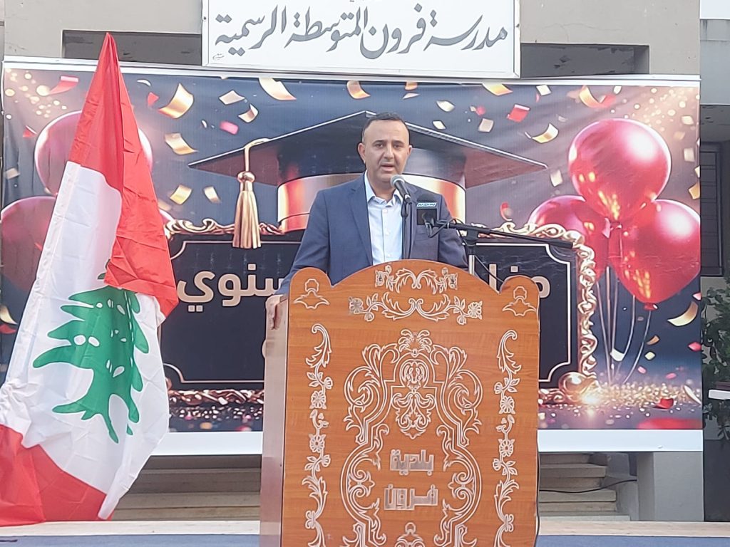 راعي الحفل النائب الدكتور أشرف بيضون إستهل كلمته بتوجيه التحايا النابعة من القلب للقلب مثمنا” جهود الخريجين وأهاليهم ، وأضاف “لأننا في صرح تربوي عريق لبلدة عريقة في جبل عامل الأبية ولأن الحديث عن مبادرات ، تم منذ يومين إطلاق مبادرة تربوية بتوجيه من دولة الرئيس نبيه بري و بالتعاون مع المكتب التربوي لاقليم جبل عامل، عنوانها صمود وتفوق، مؤكدًا أن أهالي فرون سيكون لهم نصيب من هذه المبادرة”.