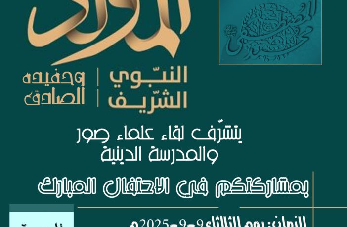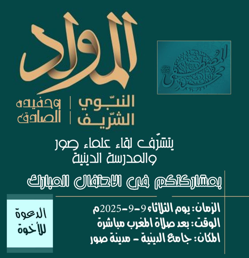 محليات دعوة للمشاركة في احتفال المولد النبوي الشريف وولادة حفيده الصادق (ع) يوم الثلاثاء في صور By F.S سبتمبر 8, 2025 لا توجد تعليقات الصادق صور