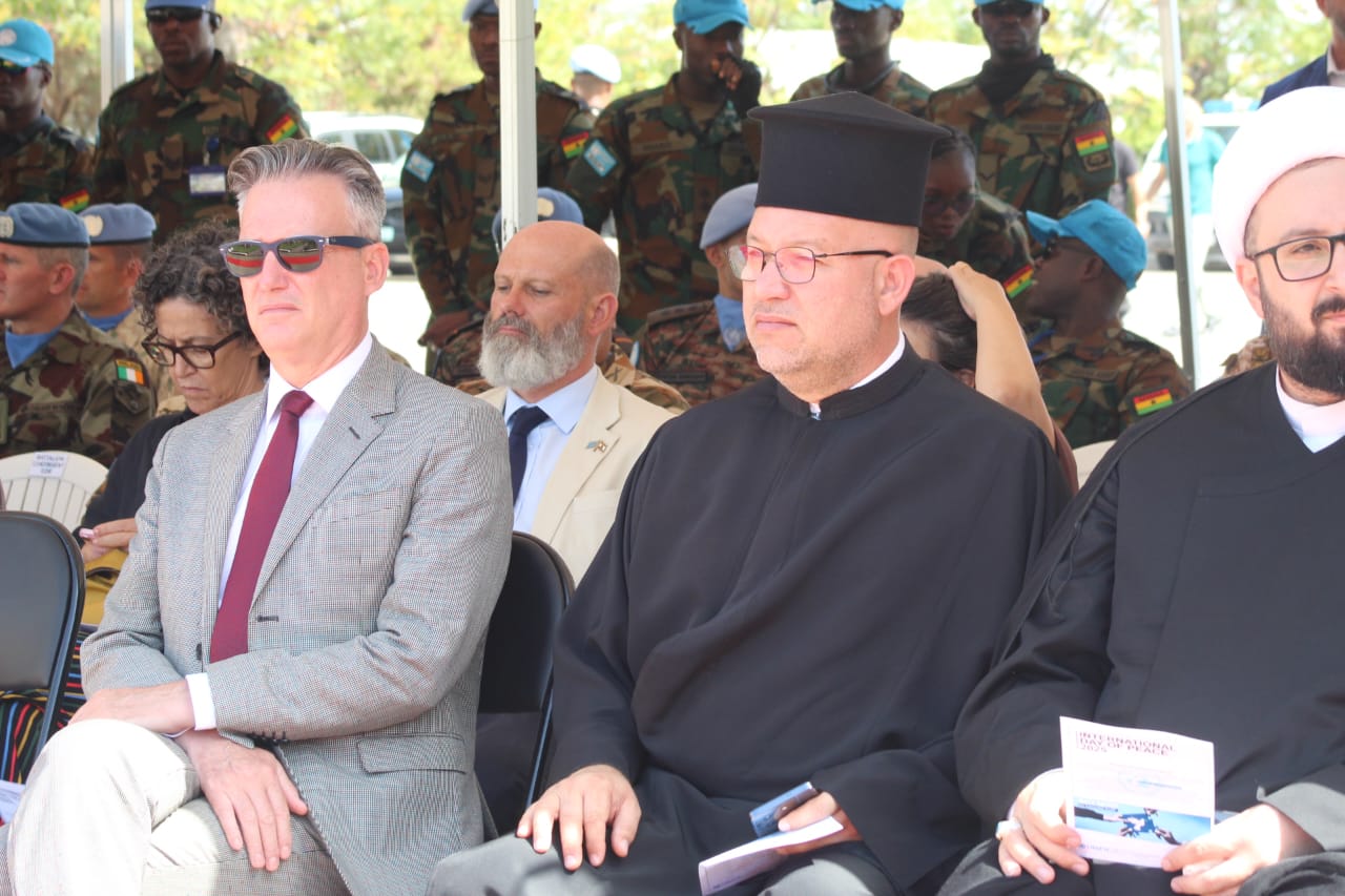 وكبار ضباط الجيش واليونيفيل وفاعليات سياسية وروحية وبلدية وموظفي اليونيفيل ، وبعد النشيدين اللبناني والامم المتحدة ورفع الأعلام ودقيقة صمت عن اروح ضحايا اليونيفيل أقيم عرض عسكري رمزي وضع الجنرال التيار والعنيد تابت إكليلين من الزهر على النصب التذكاري لضحايا اليونيفيل