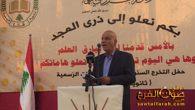 كلامه جاء خلال رعايته الإحتفال التكريمي للطلاب الناجحين في شهادة الثانوية العامة دفعة ” التحدي والنجاح” في ثانوية قانا الرسمية، حيث هنّأ الطلاب قائلاً: “رغم ما يحدث من اعتداءات إسرائيلية على مستوى كل الوطن وخاصة على مستوى الجنوب، إلاّ أننا نجد في كل المدارس الرسمية والخاصة نجاحات باهرة للطلاب”.