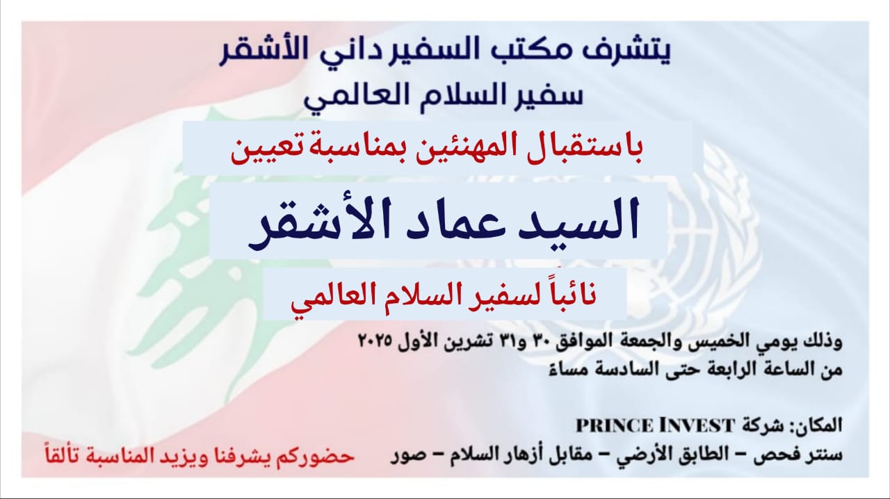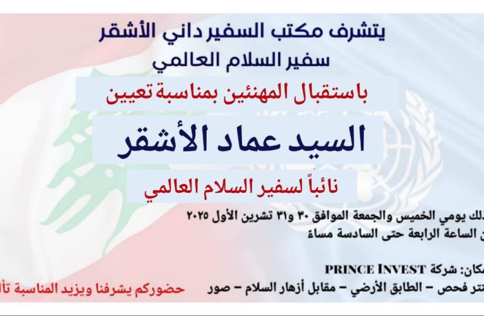 محليات مكتب السفير داني الأشقر في صور يتقبل التهاني بتعيين نائبه By F.S أكتوبر 28, 2025 لا توجد تعليقات الأشقر