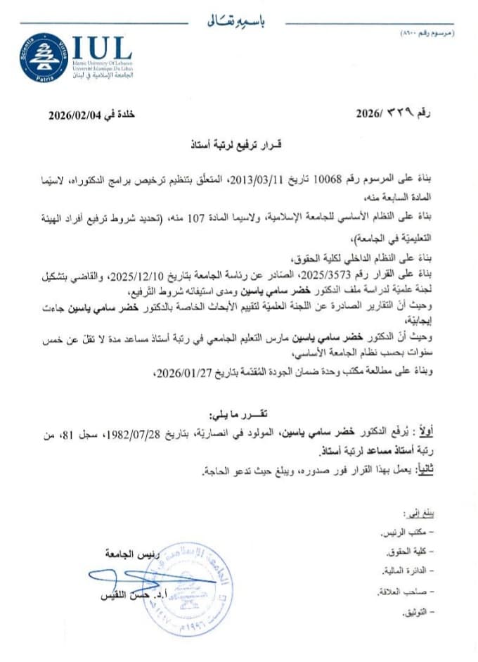 نبارك للدكتور مصطفى علي حمدان حصوله على شهادة الدكتوراه في الحقوق بتقدير ممتاز (العلامة ٩٣/١٠٠) يناير 27, 2026