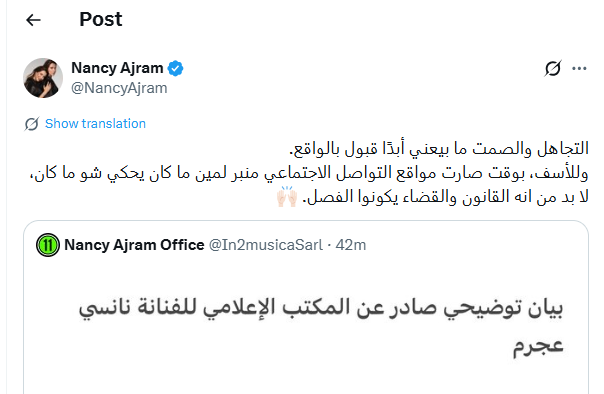 ونشرت الفنانة اللبنانية بياناً صادراً عن مكتبها الإعلامي جاء فيه: “يهم المكتب الإعلامي للفنانة نانسي عجرم توضيح أن ما يتم تداوله مؤخراً من شائعات ومعلومات كاذبة يندرج ضمن إطار الافتراء والتشهير المتعمّد، ولا يمتّ إلى الحقيقة بصلة، كما أن ربط اسمها بأي ملفات أو جهات هو أمر عارٍ تماماً من الصحة”.