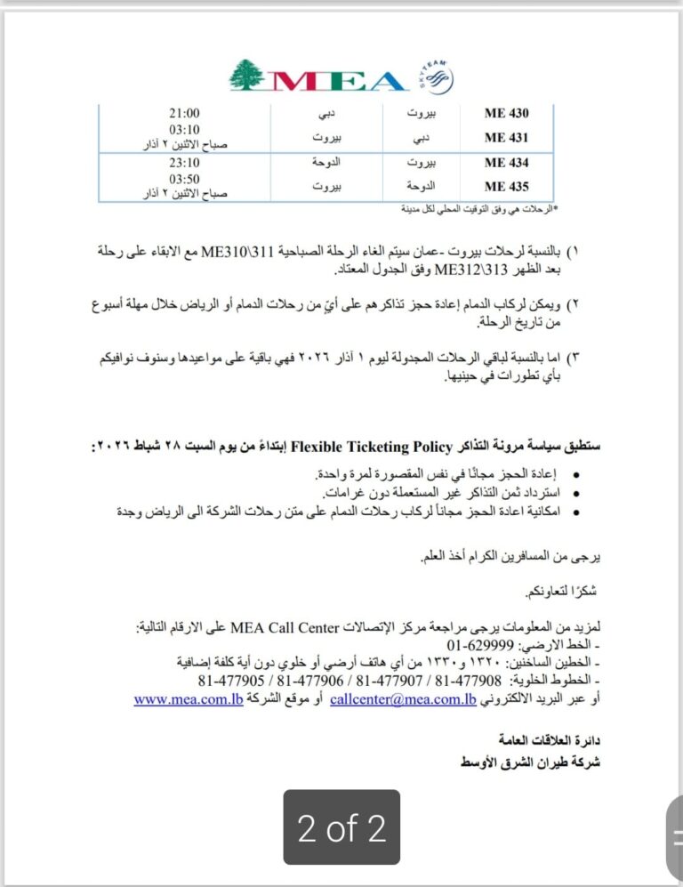 محليات طيران الشرق الأوسط تصدر جدول تعديلات على رحلاتها اليوم 1 آذار By F.S مارس 1, 2026 لا توجد تعليقات شركة طيران الشرق الأوسط