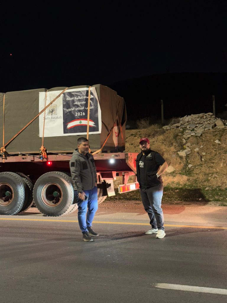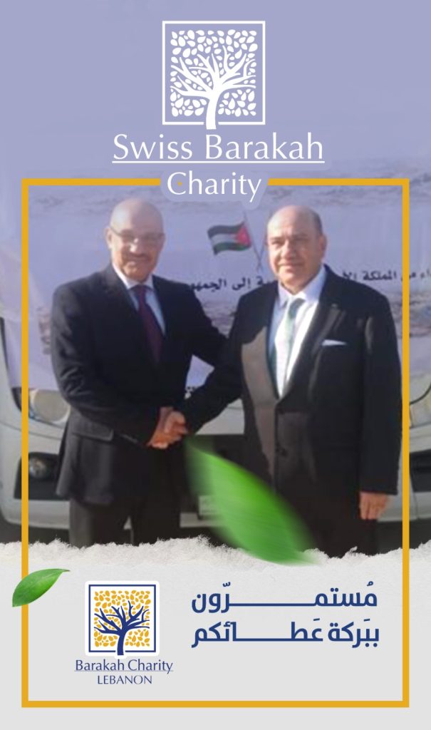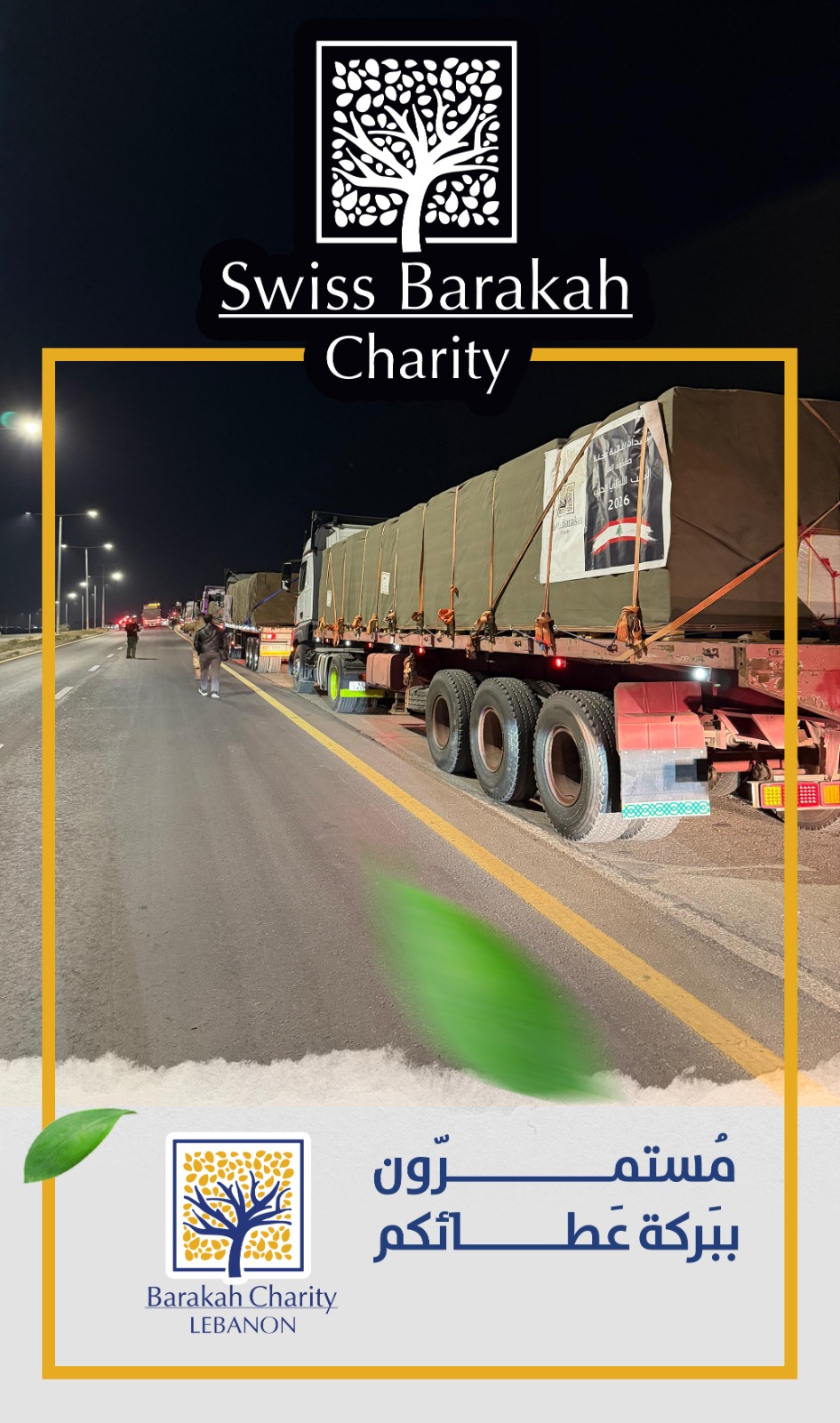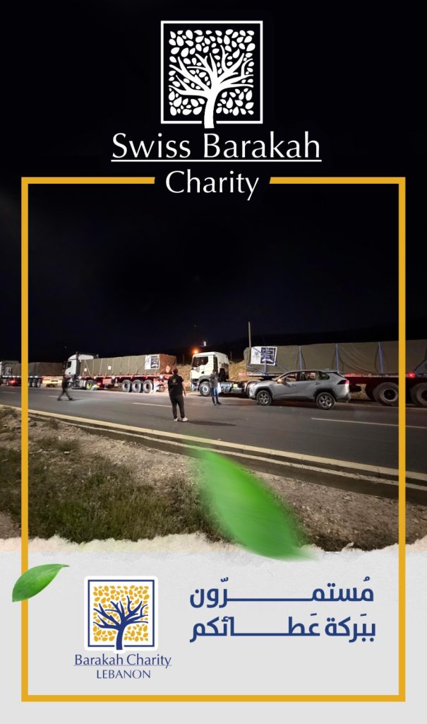 قامت SWISS BARAKAH CHARITY – عبر فرعها بالأردن، ومن خلال الهيئة الأردنية الهاشمية، بتسيير قافلة مساعدات إغاثية إلى لبنان الحبيب، من ضمن القافلة التي أرسلت من المملكة الأردنية الهاشمية الشقيقة، حيث تم إرسالها عبر القوات المسلحة الأردنية إلى الهيئة العليا للإغاثة.