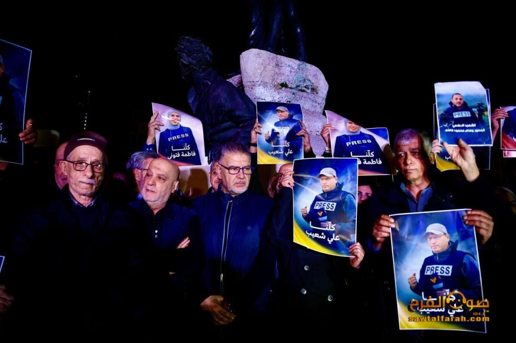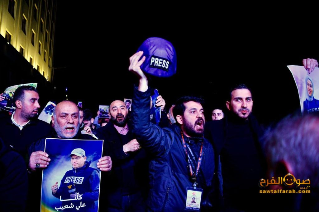 شهدت العاصمة بيروت اليوم مسيرة تضامنية واسعة استنكاراً للعدوان الهمجي على الصحفيين، الذي أدى إلى استشهاد مراسل قناة المنار الحاج علي شعيب و مراسلة ومصور قناة الميادين.