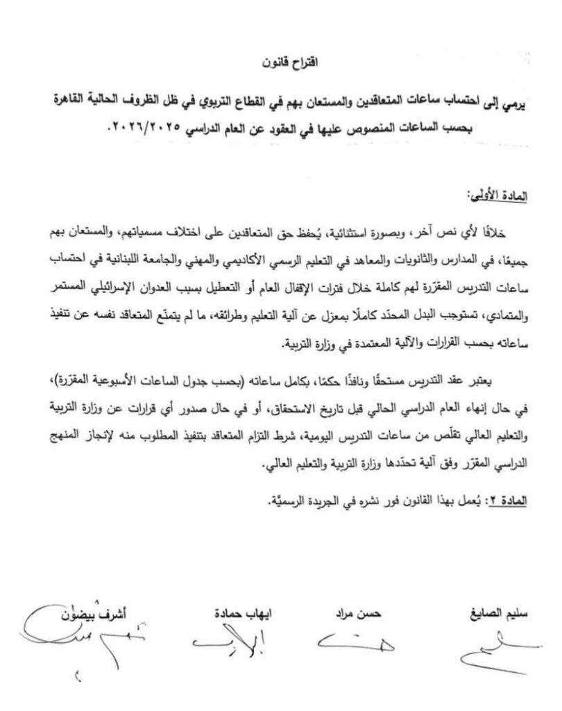 إننا نثمن عالياً هذا الموقف النبيل الذي يقر بالحقوق المهنية والإنسانية لأساتذة نذروا أنفسهم لخدمة أبناء الوطن. ولكن، وفي ظل الظروف الراهنة التي لا تحتمل التأجيل أو المماطلة، فإن شكرنا وتقديرنا يرافقه تطلع حثيث وثقة كبيرة في أن تبذلوا ذات الجهود والمثابرة لضمان مصير هذا القانون الحتمي نحو التنفيذ الكامل والفوري.
