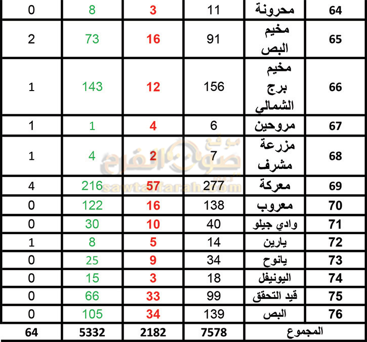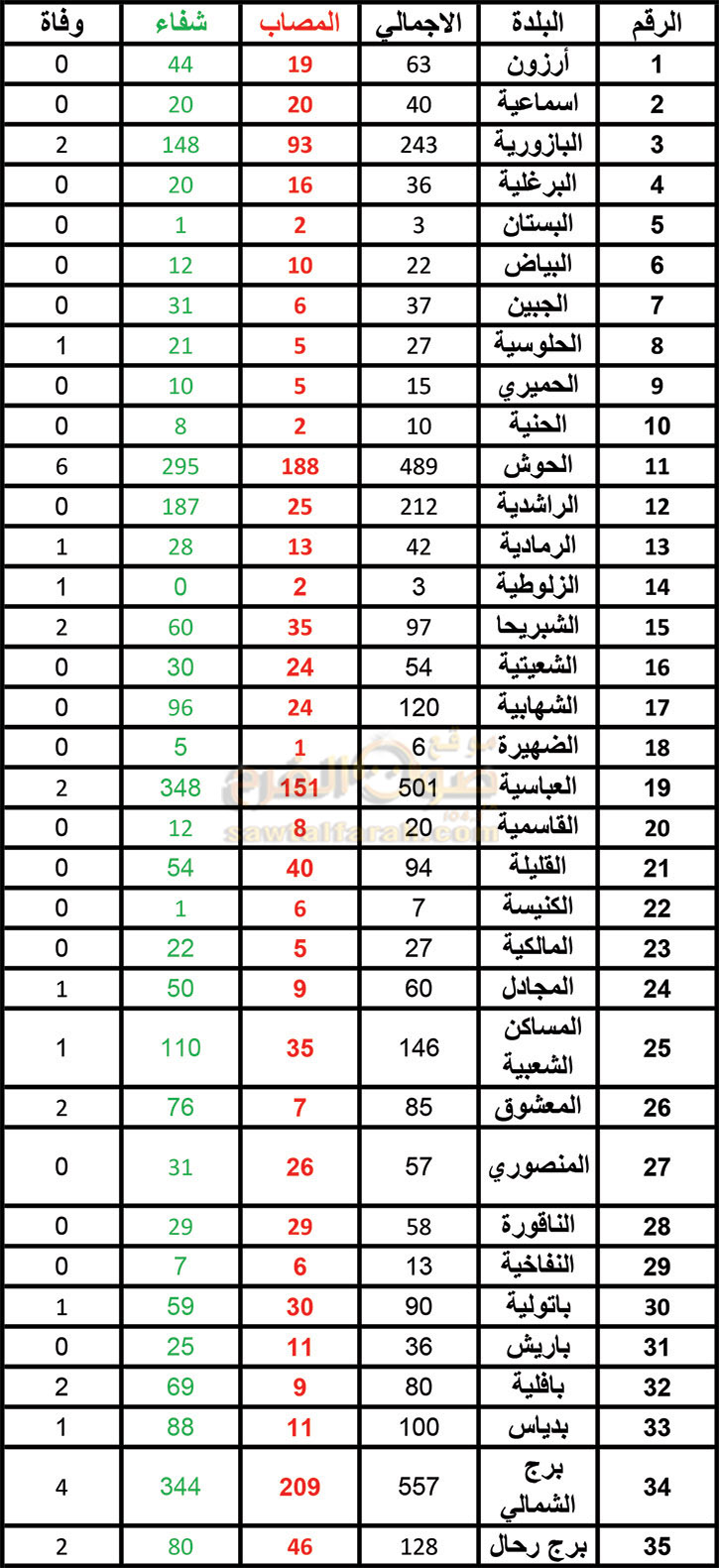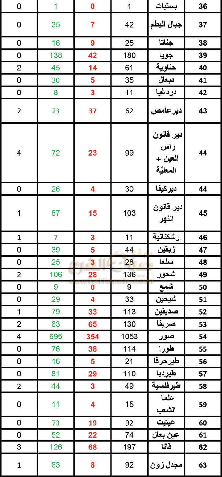 وردنا من وحدة إدارة الكوارث في إتحاد بلديات قضاء صور جدول الأعداد المتراكمة لمصابي كورونا في القضاء والذي ضمّ العدد الإجمالي للمصابين في كل بلدة منذ بدء الجائحة وأعداد الذي أتموا العلاج والعدد التراكمي للمصابين والوفيات لغاية تاريخ نشر هذا التقرير.
