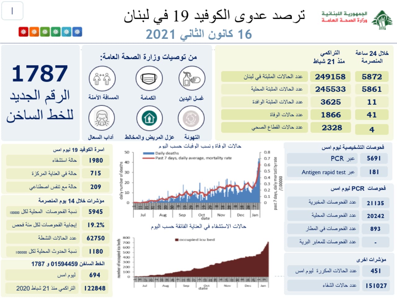 محليات وزارة الصحة اللبنانية: تسجيل 5872 إصابة جديدة و 41 حالة وفاة بفيروس كورونا By F.S يناير 16, 2021 لا توجد تعليقات featured كورونا لبنان