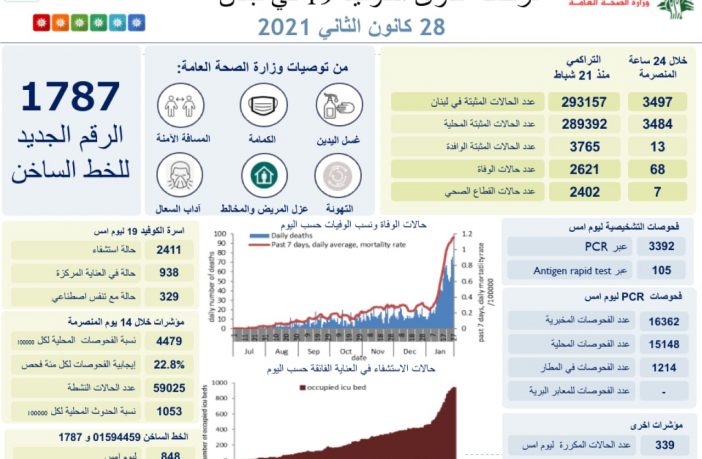 محليات وزارة الصحة اللبنانية: تسجيل 3497 إصابة جديدة و 68 حالة وفاة بفيروس كورونا By F.S يناير 28, 2021 لا توجد تعليقات featured اخبار لبنان