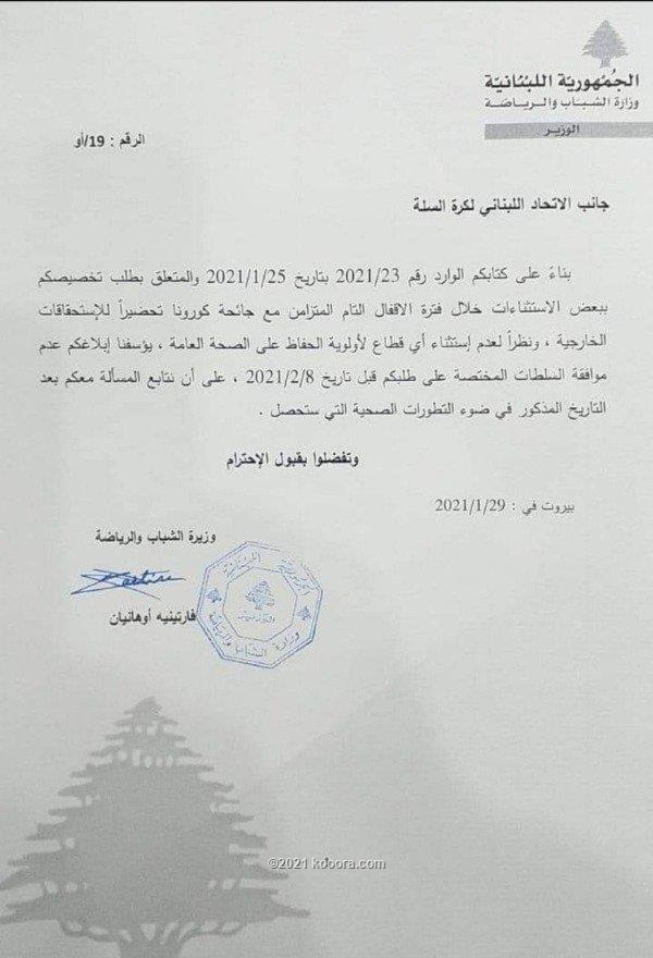 وكانت الحكومة اللبنانية قد أكدت أنها لن تسمح بأي استثناء للقطاع الرياضي بكل اتحاداته، لاستئناف الأنشطة، قبل نهاية فترة الحجر المفروضة على البلاد.