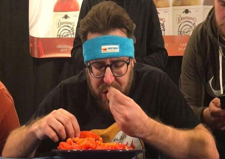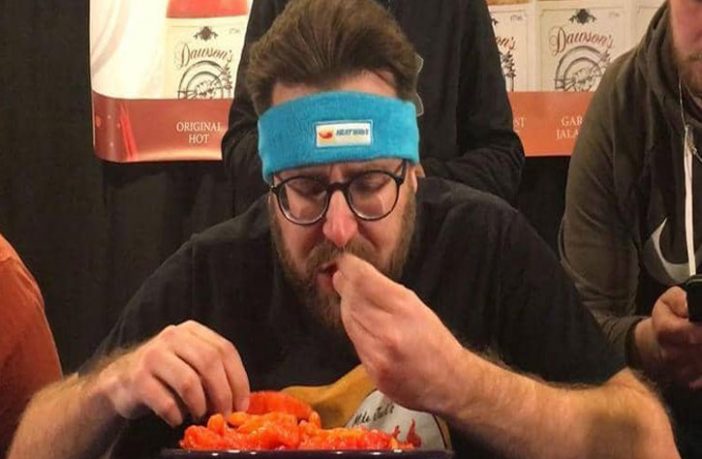 أما رقمه القياسي الثاني، فسجله لاستهلاك أكبر عدد من فلفل “بوت جولوكيا” الحار، أو “فلفل بوتان الحار” المعروف أيضا باسم “الفلفل الشبح”، في دقيقة واحدة، والذي حققه في 2 مارس 2019، عندما تناول 97 غراما.