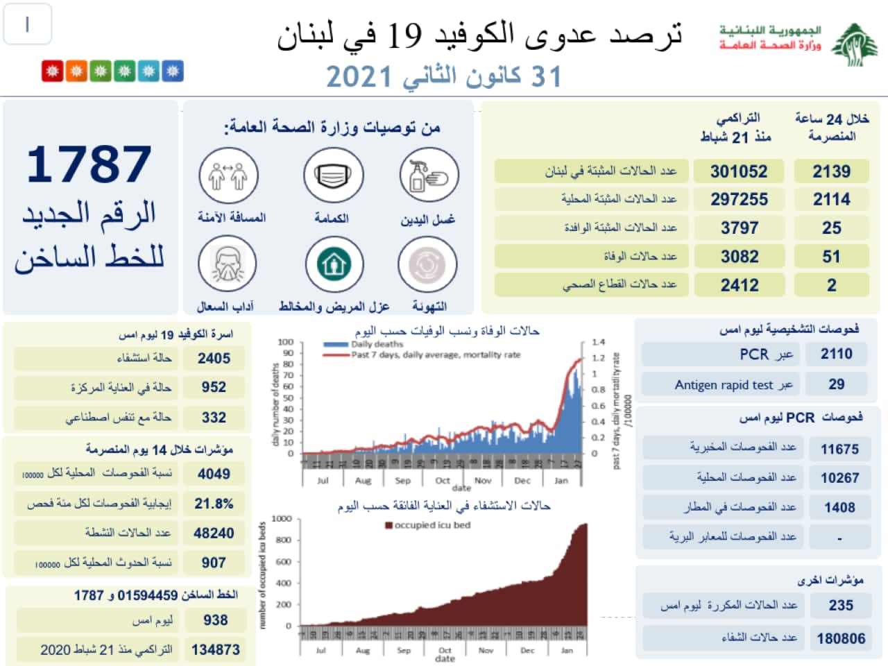 محليات وزارة الصحة اللبنانية: تسجيل 2139 إصابة جديدة و 51 حالة وفاة بفيروس كورونا By F.S يناير 31, 2021 لا توجد تعليقات featured وزارة الصحة