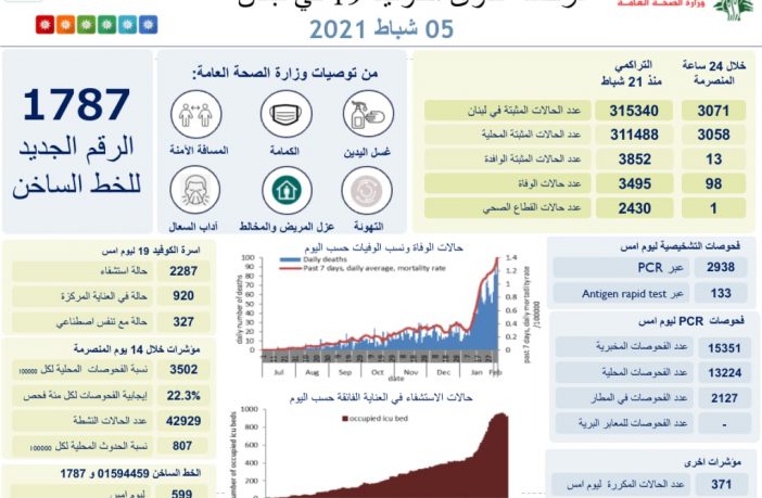 محليات وزارة الصحة: 98 حالة وفاة و3071 إصابة كورونا جديدة بفيروس كورونا في لبنان By F.S فبراير 5, 2021 لا توجد تعليقات featured لبنان