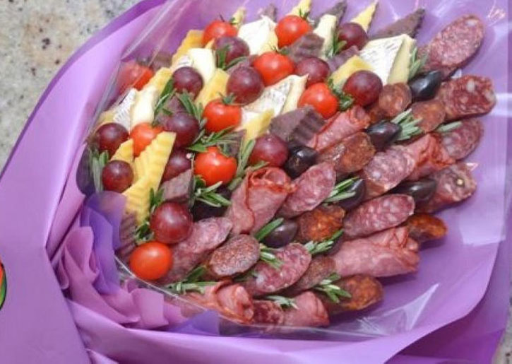 وصمم الطهاة المبدعون باقات مميزة تتكون من أسياخ اللحم بدلا من الزهور ومكعبات الجبن والفواكه والخضروات وغيرها، وكلها ملفوفة مثل بوكيه الورد لكن في الورق، مع بعض الأوراق الخضراء كخلفية منمقة.