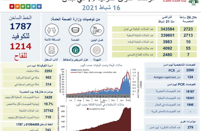 محليات وزارة الصحة: تسجيل 2723 إصابة جديدة بفيروس كورونا و55 حالة وفاة By F.S فبراير 16, 2021 لا توجد تعليقات featured وزارة الصحة