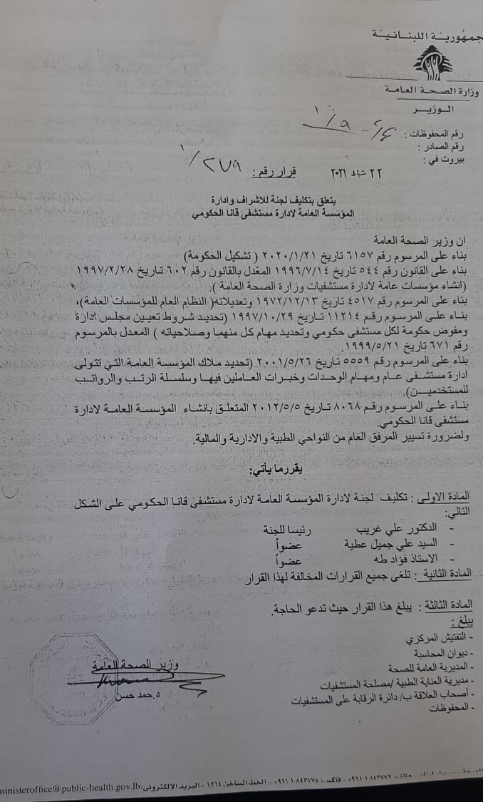 محليات تكليف لجنة جديدة لإدارة مستشفى قانا الحكومي By F.S فبراير 22, 2021 لا توجد تعليقات featured مستشفى قانا الحكومي
