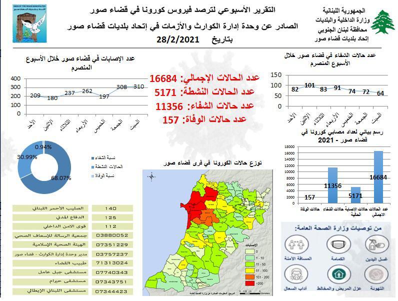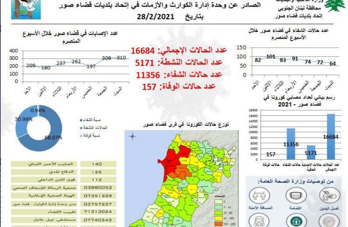 وفقاً لجدول الأعداد المتراكمة لمصابي كورونا في قضاء صور الذي وردنا من وحدة إدارة الكوارث في إتحاد بلديات قضاء صور والذي ضمّ العدد الإجمالي للمصابين في كل بلدة منذ بدء الجائحة لغاية يوم الجمعة الماضي، إليكم لائحة “التوب 10 ” لإجمالي المصابين في كل بلدة: