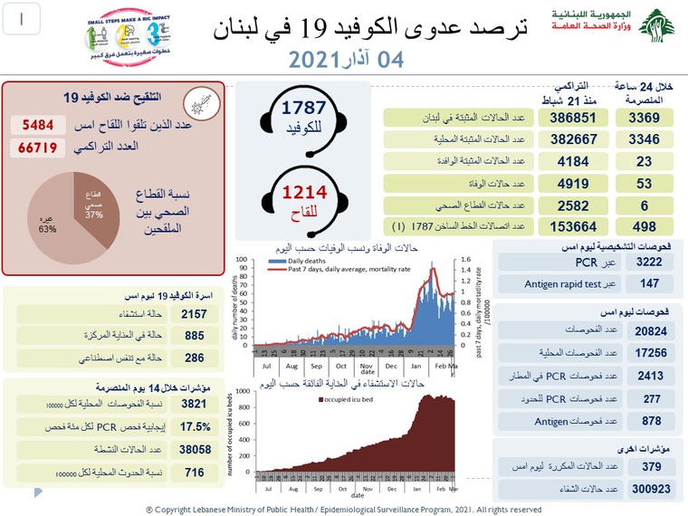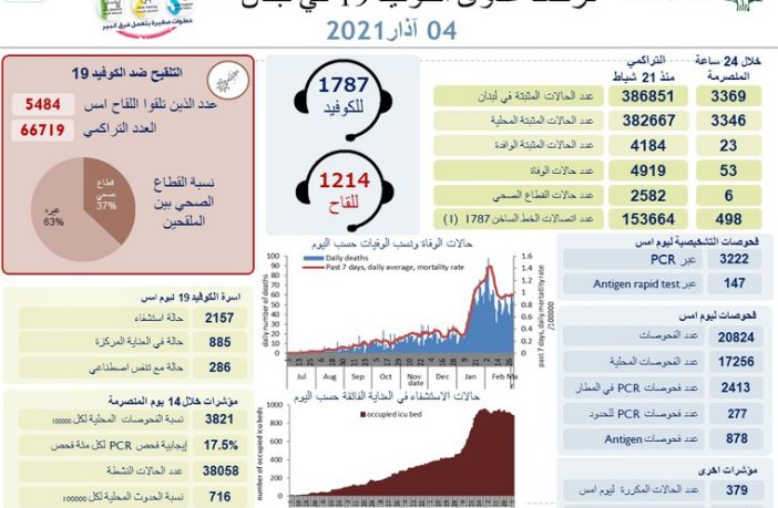 محليات وزارة الصحة: تسجيل 53 حالة وفاة و3369 إصابة جديدة بفيروس كورونا By F.S مارس 4, 2021 لا توجد تعليقات featured وزارة الصحة