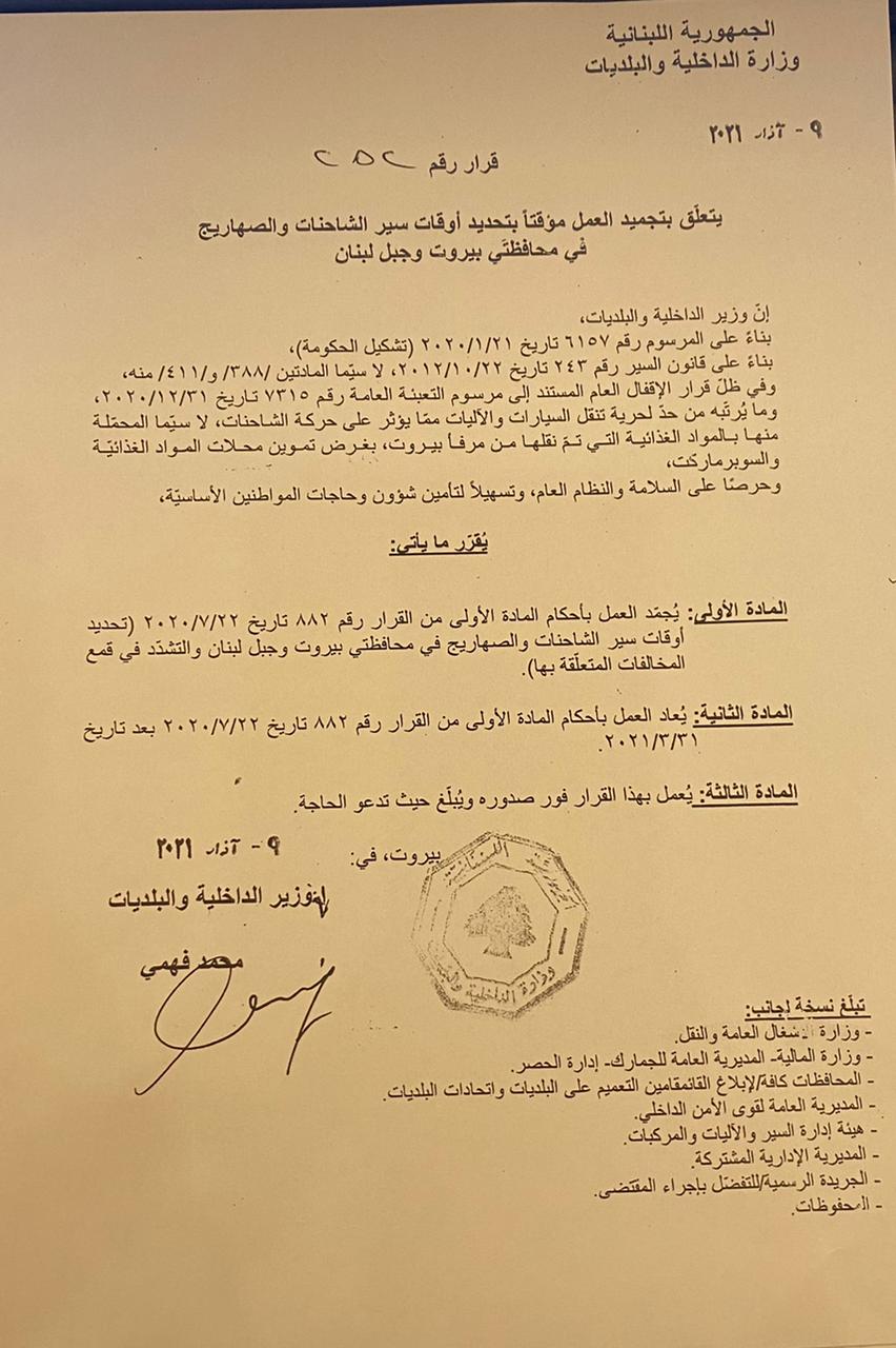 أصدر وزير الداخلية والبلديات العميد محمد فهمي قراراً قضى بموجبه تجميد العمل موقتاً بتحديد أوقات سير الشاحنات والصهاريج في محافظتَي بيروت وجبل لبنان، وذلك من تاريخه ولغاية 31-3-2021 ضمناً، على ان يعاد العمل بأحكام المادة الاولى من القرار رقم 882 تاريخ 22-7-2020 المتعلق بتحديد أوقات سير الشاحنات والصهاريج في محافظتَي بيروت وجبل لبنان بعد نهاية الشهر الجاري.