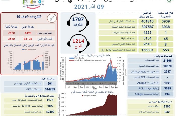 محليات وزارة الصحة اللبنانية: تسجيل3939 إصابة جديدة و45 حالة وفاة بفيروس كورونا By F.S مارس 9, 2021 لا توجد تعليقات featured وزارة الصحة