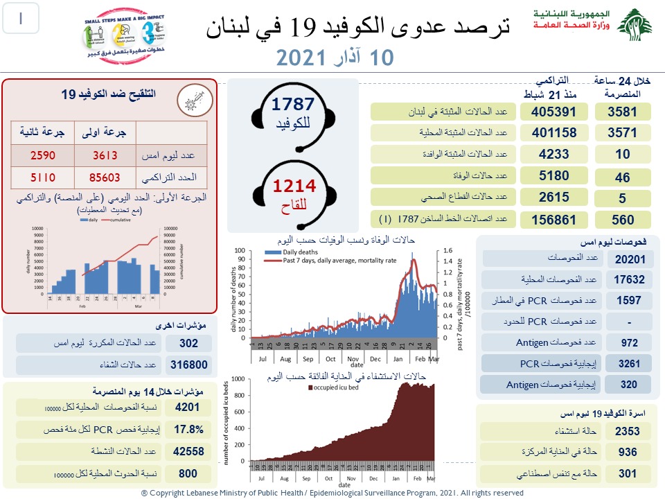 محليات وزارة الصحة اللبنانية: تسجيل 46 وفاة و3581 إصابة جديدة بفيروس كورونا By F.S مارس 10, 2021 لا توجد تعليقات featured وزارة الصحة