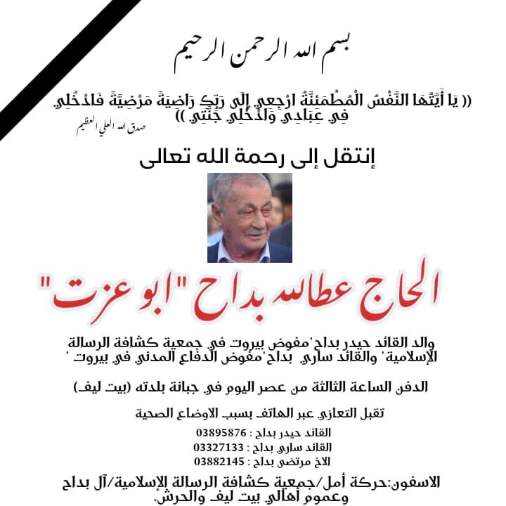 الدفن الساعة الثالثة من عصر اليوم في جبانة بلدته (بيت ليف)